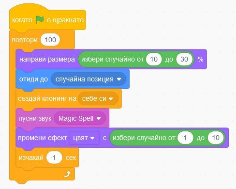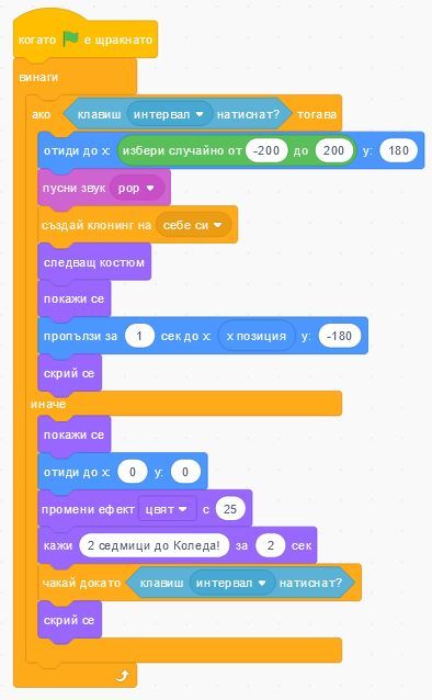 В тази задача ще създадете своя собствена компютърна анимация, в която снежинките ще се клонират, а подаръците ще се появяват по ваша команда и ще ви казват колко седмици остават до Коледа!