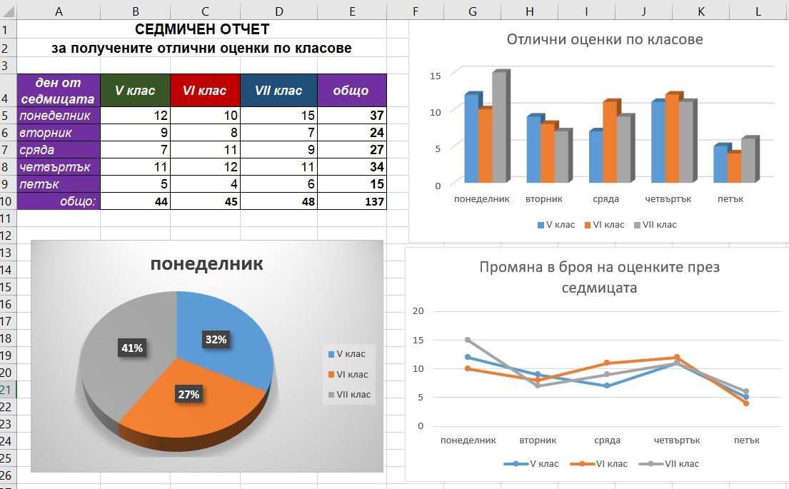 Изтеглете файла и в зад. 1 добавете формули за изчисляване на общия брой оценки (сумиране).