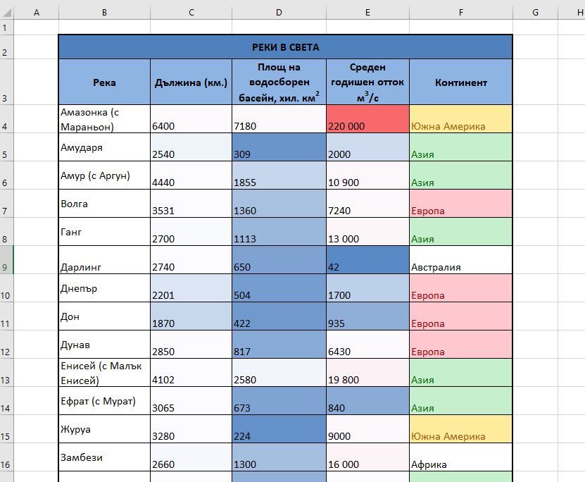 Задайте форматиране на цифровите данни с подходящи цветови схеми (Conditional Formatting - Color Scales);