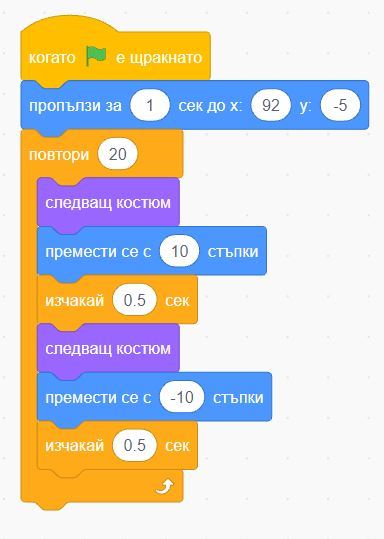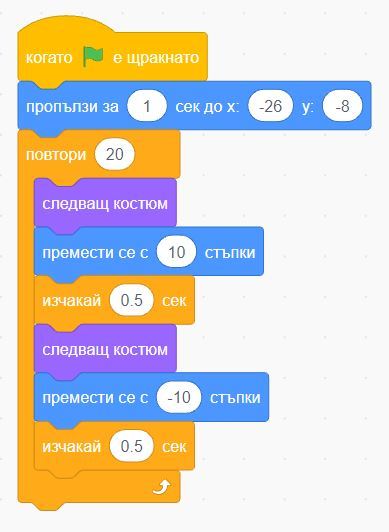 По-долу е показан примерeн код на танцьорите, за изпълнението на задачата. Може да импровизирате и да промените кода, стига да получите сходен резултат.