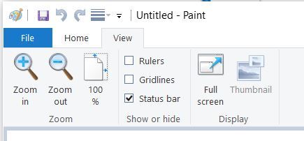 В менюто View се намират групите с инструменти за визуализиране на допълнителни ленти и свойства към работния екран на Paint. Добавянето и премахването на тези ленти се определят от състоянието на полетата с отметки (checkbox).