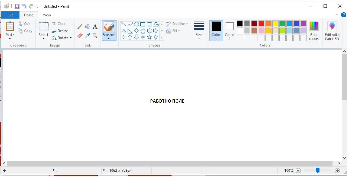 Най‐голяма част от екрана на Paint се заема от правоъгълната област, наречена работно поле. В нея се създават или редактират изображенията. Тази зона е достъпната за работа, а размерите може да бъдат променяни с помощта на манипулаторни точки (манипулатори).