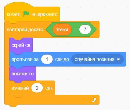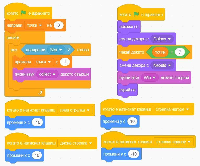 В тази задача вашият герой - робот ще трябва да улови поне 7 звезди. Трябва да програмирате роботчето да се движи в 4-те посоки с помощта на четирите стрелки на клавиатурата. За всяка уловена звезда ще получавате 1 точка, затова създайте променлива, която да отчита точките. Играта спира, когато се уловят 7 звезди!