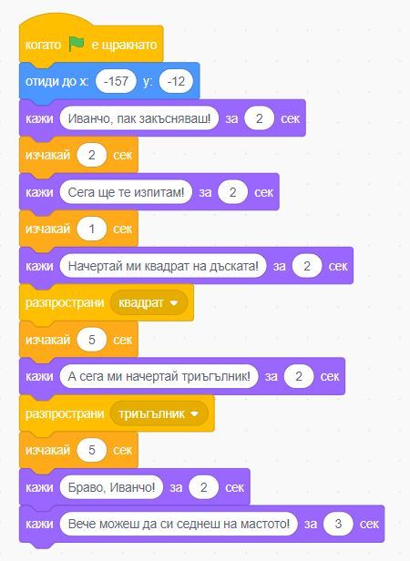 В тази задача единият герой е учителя, който задава въпроси и задачи на другия герой - ученика. По-долу са ви дадени примерни кодове на героите, но вие можете да добавите и допълнителни въпроси към изпитването.