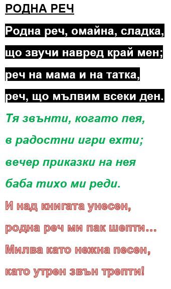 В същия файл от предишната задача копирайте текста на стихотворението "Родна реч" на Ран Босилек и с инструментите на програмата MSWord го форматирайте така, че да бъде с цветовете на българското знаме: