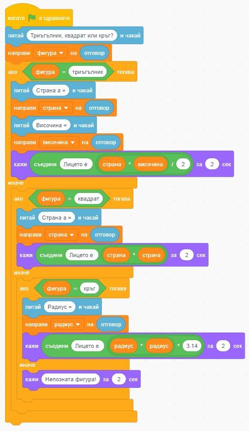По-долу са дадени примерни изпълнения на задачата със Scratch и Python, вие можете да импровизирате и да промените програмите по ваша преценка, стига да получите сходен резултат. Можете да сложите и други геометрични фигури по ваш избор.