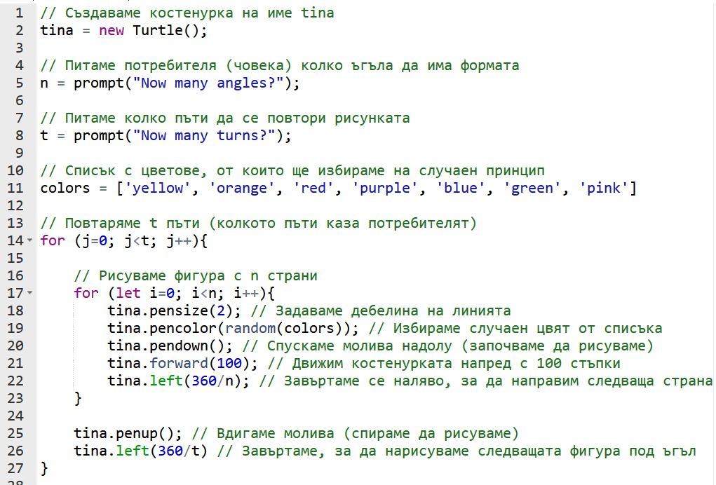 Примерен вид на крайния резултат можете да видите по-долу. Дадено ви е и примерно изпълнение на проекта в JavaScript, където са използвани списък за цветовете и костенурка turtle, която да чертае. Вие можете да импровизирате и да промените програмата по ваша преценка, стига да получите сходен резултат. Например можете да добавите повече или други цветове.
