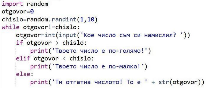 Цел: Да се създаде Python програма, която да генерира случайно число в интервала от 1 до 10, а потребителят да въвежда предложения за числото, докато то съвпадне с генерираното число.
