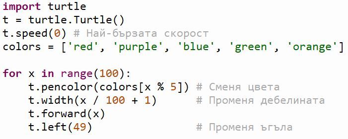 Задачата ви е да експериментирате с ъгъла (вместо 49, пробвайте 59, 90, 91, 45) и с дължината на стъпката, за да получите ваш уникален дизайн.