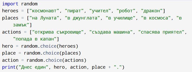 Цел: да създадеш програма, която генерира забавни истории с помощта на списъци и случайност.